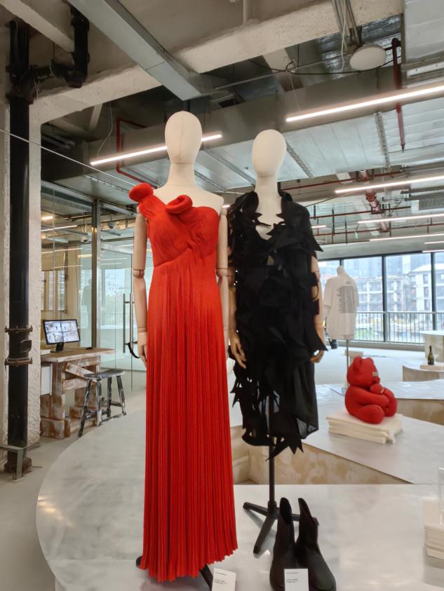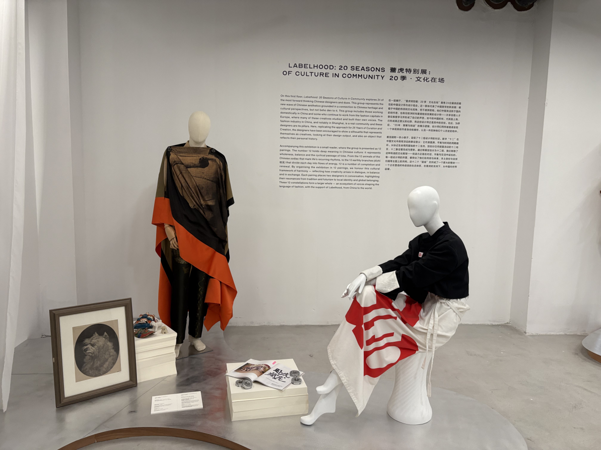 在一层的“蕾虎特别展:20季·文化在场”中,24件时装设计作品被分成十二组,并通过各自作品的两两对话,呼应中国文化中“十二”所象征的圆满与循环。参观期间,蕾虎创始人一件件介绍着设计师的创意及他们的灵感物品,从复古优雅的裙装到前卫大胆的外套,每一件都诉说着设计师们独特的创意、精湛的手工艺及与对时尚的不同诠释。由此,同学们对本土时尚又有了全新的理解,并纷纷拿出手机,拍摄记录下这些作品。