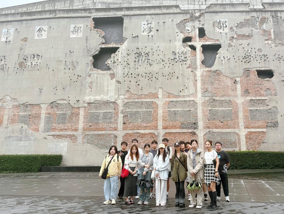 观展结束后,师生一行来到四行仓库抗战纪念馆,在经历现代都市的美好与繁华后仍不忘铭记历史、感恩先烈,开展了一场沉浸式爱国主义教育活动。四行仓库外墙面密布的弹痕如历史的烙印,静静矗立在苏州河畔,纪念馆前民众敬献的鲜花,汇聚成无声的致敬。同学们驻足凝视,在斑驳痕迹与鲜活花束的对比中,触摸到了民族记忆的温度与力量。